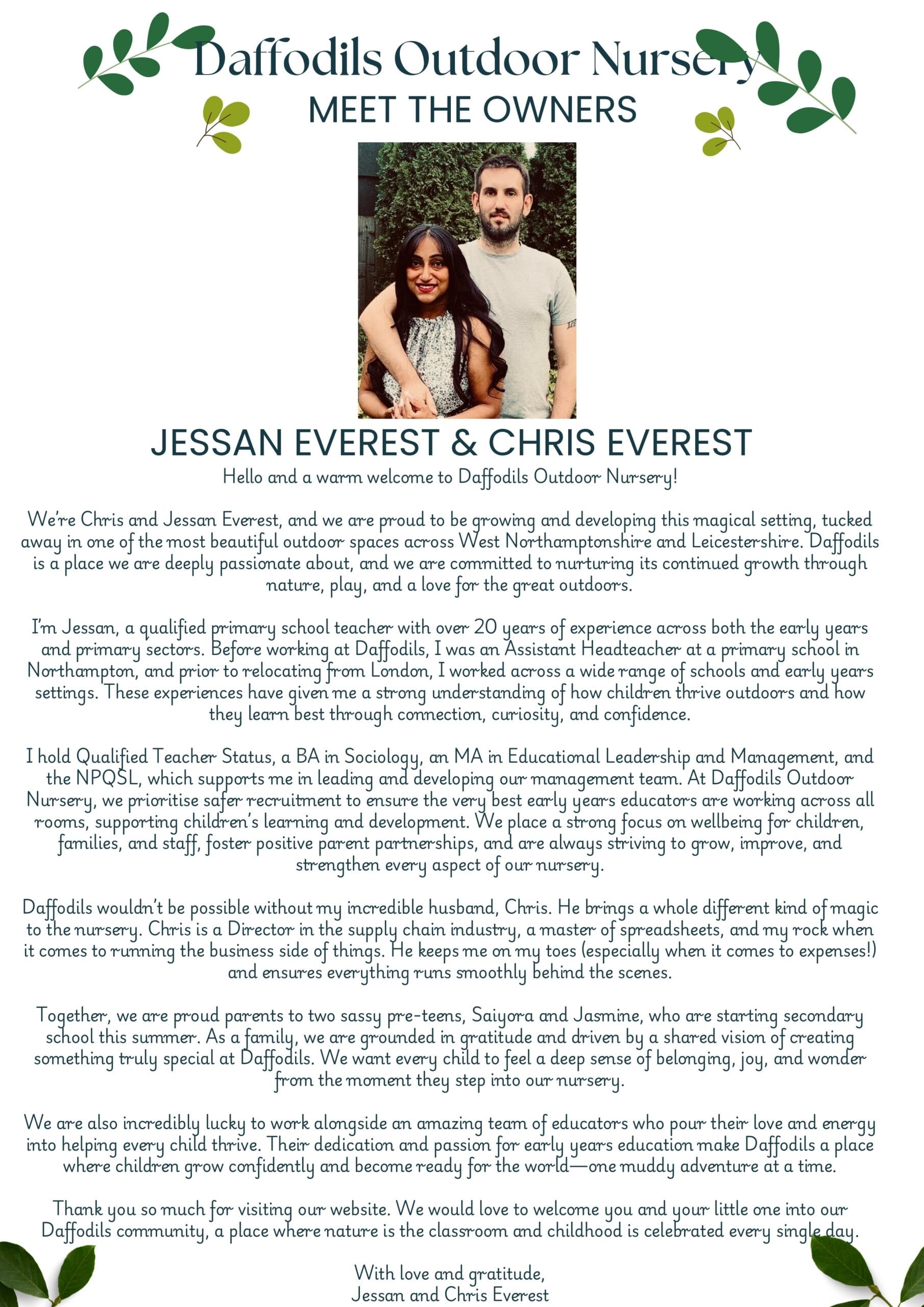 I am passionate about quality childcare and inspiring every child to reach their full potential. I am extremely excited about providing children at Daffodils with the opportunity to express themselves freely in the outdoor environment and encouraging their creative potential.